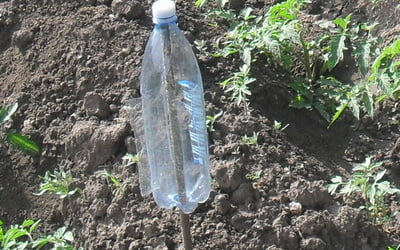 Нужно взять пластиковую бутылку(1,5 или 2 л.)и постараться вырезать в ней 3-4 лопасти(делаем надрезы вдоль бутылки отступив от дна 5 см. и режем до момента изгиба бутылки в горлышко). Затем в центре дна делаем ровное отверстие диаметром 20 мм. для того, что бы одеть бутылку на штырь соответствующего отверстию диаметра.Вставляем штырь в почву там, где предполагаем обитание вредителя. Медведка боится вибрации, которую создаёт крутящаяся на ветру бутылка и покидает территорию на которой создаётся мини-сотрясение почвы.Поэтому необходимо большое количество такого рода сооружений.